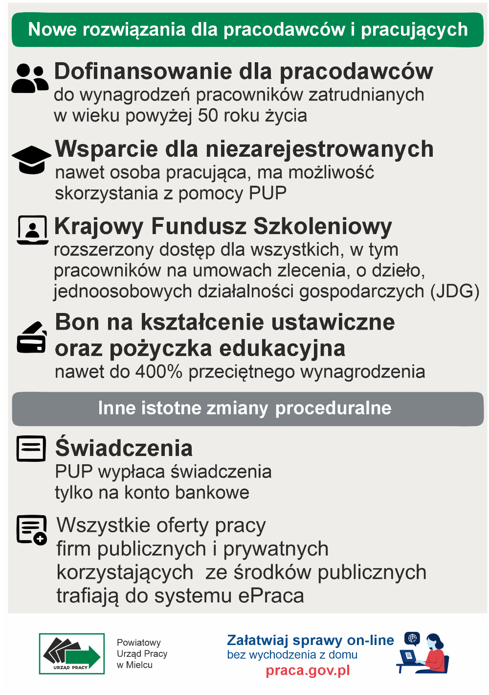 Wyjaśnione zostały zmiany proceduralne uzyskania zasiłku dla bezrobotnych, kwestie zniesienia obowiązkowych wizyt w urzędzie, na rzecz innych form kontaktu, a także braku negatywnych konsekwencji nieprzyjęcia oferty pracy.