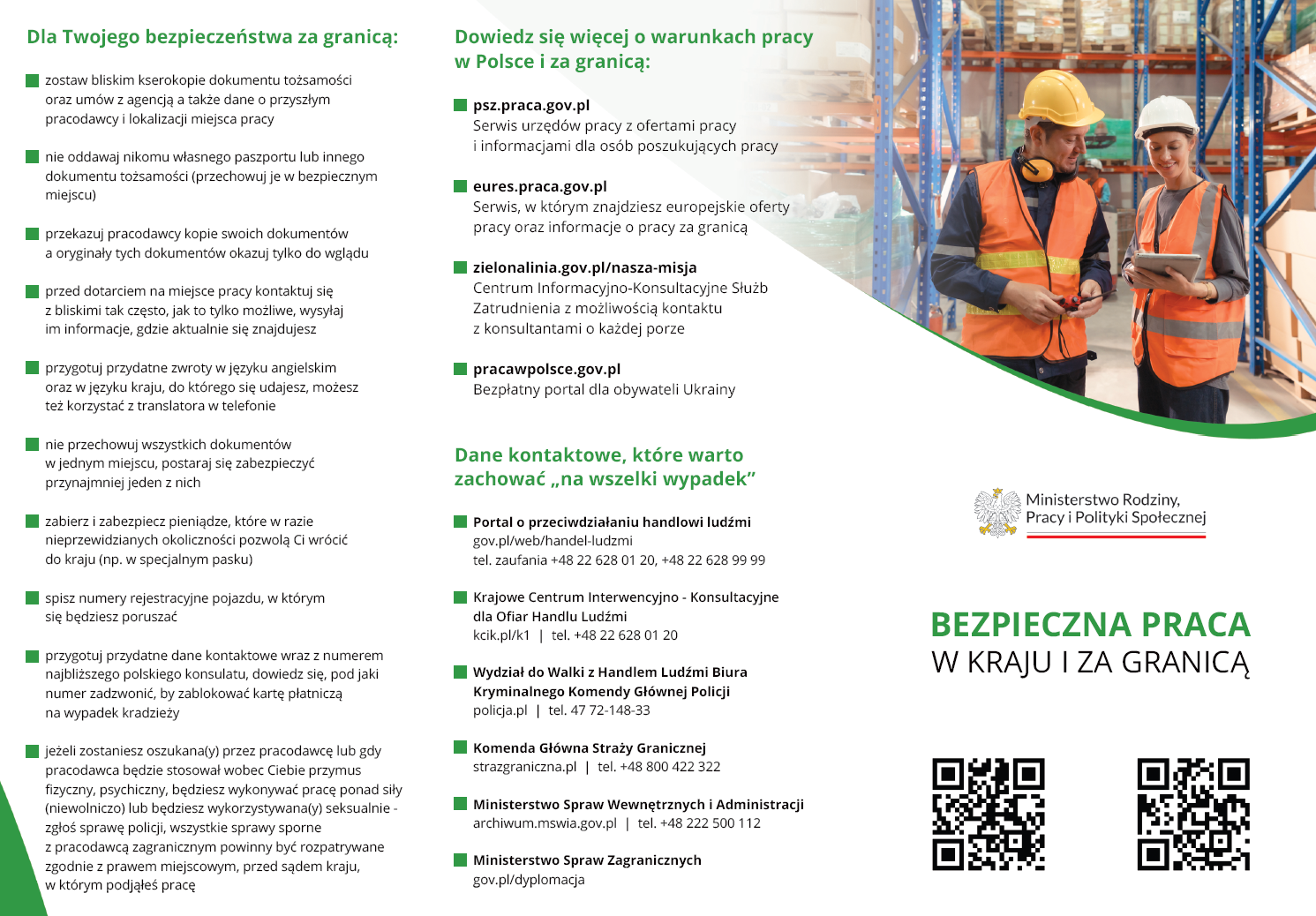 W zakresie rynku pracy uwzględniono statystyki, analizy, informacje o pracodawcach, agencjach zatrudnienia oraz spółdzielniach socjalnych. Przedstawiono metody poszukiwania pracy, w tym za pośrednictwem sieci EURES, oraz zasady legalnego zatrudniania cudzoziemców i warunki życia i pracy w Polsce. Omówiono również kwestie pracy sezonowej za granicą oraz prawa pracowników delegowanych.